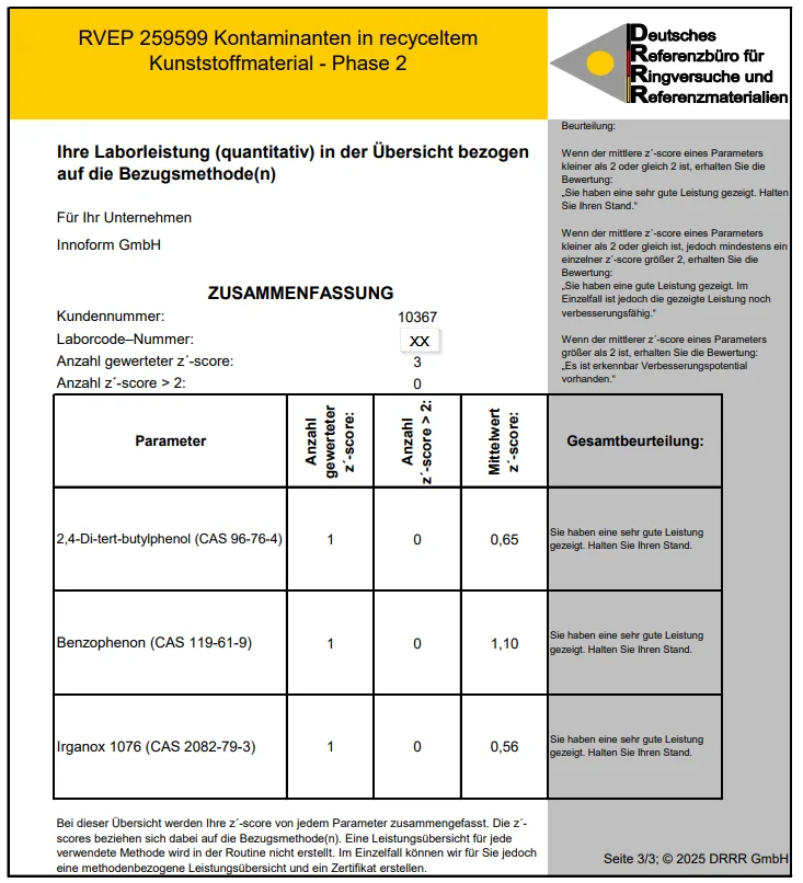 Innoform hat erneut seine Expertise unter Beweis gestellt: Beim DRRR-Ringversuch „Kontaminanten in recyceltem Kunststoffmaterial – Phase 2 (RVEP 259599)“ erzielte unser Team erneut sehr gute Resultate. Die Untersuchung der Kontaminanten in Rezyklaten ist entscheidend für die Qualität von Lebensmittelverpackungen.