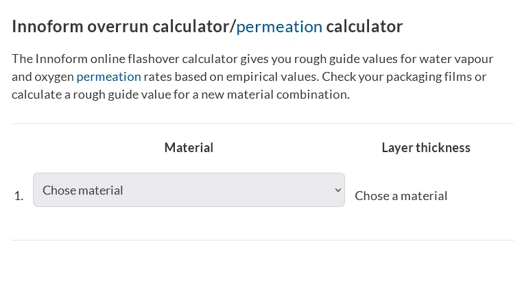 Sie wollen schnell wissen, wie sich Ihr Folienaufbau auf Sauerstoff- und Wasserdampfbarriere auswirkt? Geben Sie einfach Materialien und Schichtdicken nacheinander ein – und Sie erhalten sofort ein Überschlagsergebnis für die OTR und die WVTR, die beiden wichtigsten Kennwerte bei Lebensmittelverpackungen.