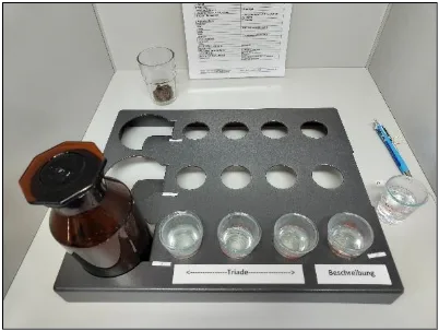Die Prüfung erfolgt als sog. verschlüsselte Dreiecksprüfung, kombiniert mit einem Difference from Control Test (DfC-Test) sowie einer einfach beschreibenden Prüfung. In einem ersten Schritt erhält jede Prüfperson drei Probengläser (sog. Triade), in denen sich die eigentliche Probe sowie die Referenzprobe befinden. Dabei wird ermittelt, ob ein signifikanter Unterschied zwischen Probe und Referenzprobe festgestellt werden kann. Im Anschluss daran wird die Probe im Vergleich zur Referenz anhand einer Intensitätsskala von 0 (keine Abweichung erkennbar) bis vier (starke Abweichung) beurteilt (DfC-Test), ab einer Note von 2 (schwache Abweichung) wird zudem eine Beschreibung des Geschmacks abgegeben (z.B. süßlich, bitter, etc.).
